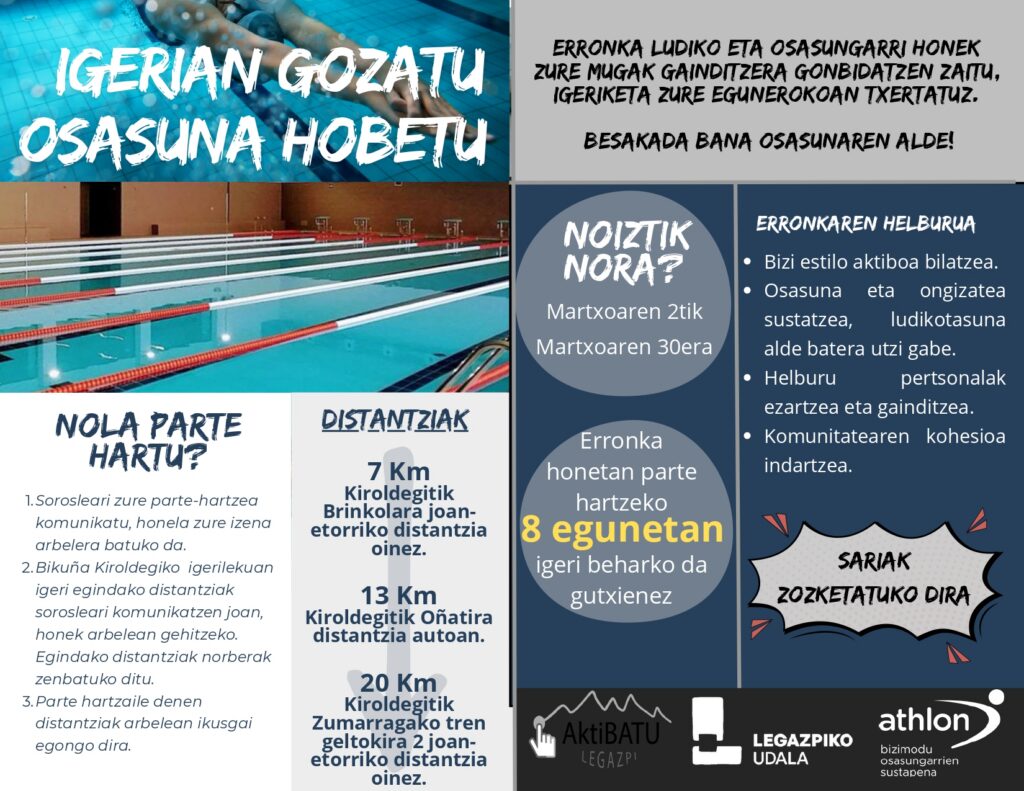 Dentro de la iniciativa Aktibatu Legazpi, del 2 al 30 de marzo se ha puesto en marcha el Reto de la Piscina en el Polideportivo Bikuña. Esta actividad se ha organizado con el objetivo de fomentar la práctica de la natación entre los ciudadanos y promover la salud. Aquellos que deseen participar deberán acumular la distancia nadada a diario y, para ello, deberán inscribirse con el socorrista.
