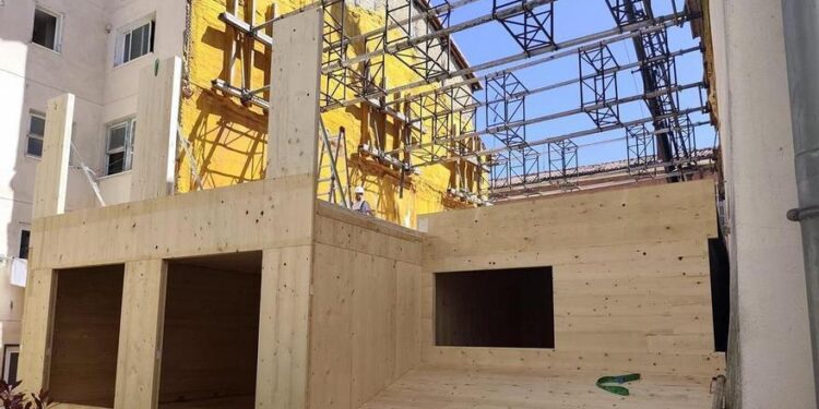 En el Casco Viejo de Vitoria-Gasteiz, se está construyendo este nuevo edificio ubicado en la calle Nueva Dentro, números 21-23, con la intención de revitalizar la construcción tradicional. Gracias a una estructura sostenible e innovadora hecha principalmente de madera, se permitirá lograr avances en arqueología urbanística y en la sostenibilidad social, según ha indicado el Ayuntamiento de Vitoria-Gasteiz.