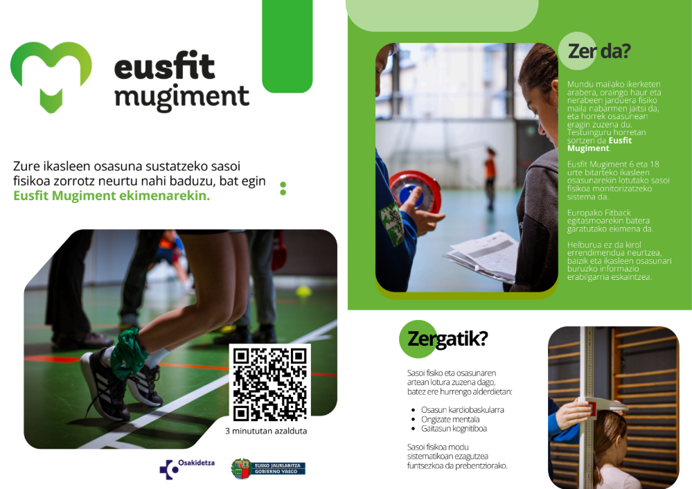 Para facilitar la difusión y comprensión de la iniciativa Eusfit Mugiment, se ha preparado un nuevo díptico. Este material está dirigido especialmente a los equipos directivos y docentes de los centros educativos, con el objetivo de dar a conocer de manera clara y práctica los objetivos, el funcionamiento y todas las opciones que ofrece la iniciativa.